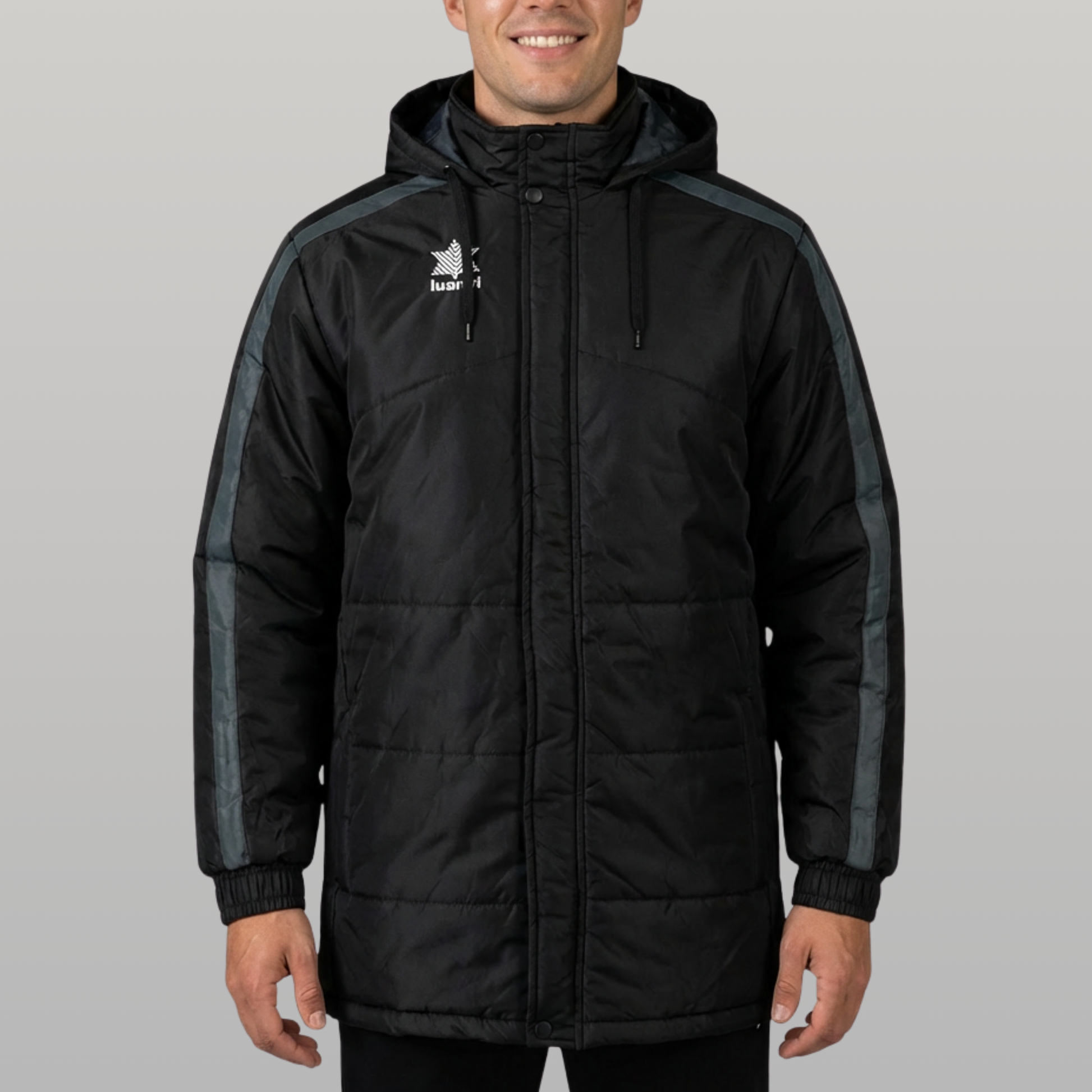 Anorak largo Luanvi GAMA, diseñado para proteger al staff y a los jugadores en los días más fríos y lluviosos. Su corte tipo parka, por debajo de la cadera, y la capucha ajustable lo convierten en una prenda ideal para estar en el banquillo, dirigir entrenamientos o viajar con el equipo manteniendo siempre una imagen de club muy cuidada.
