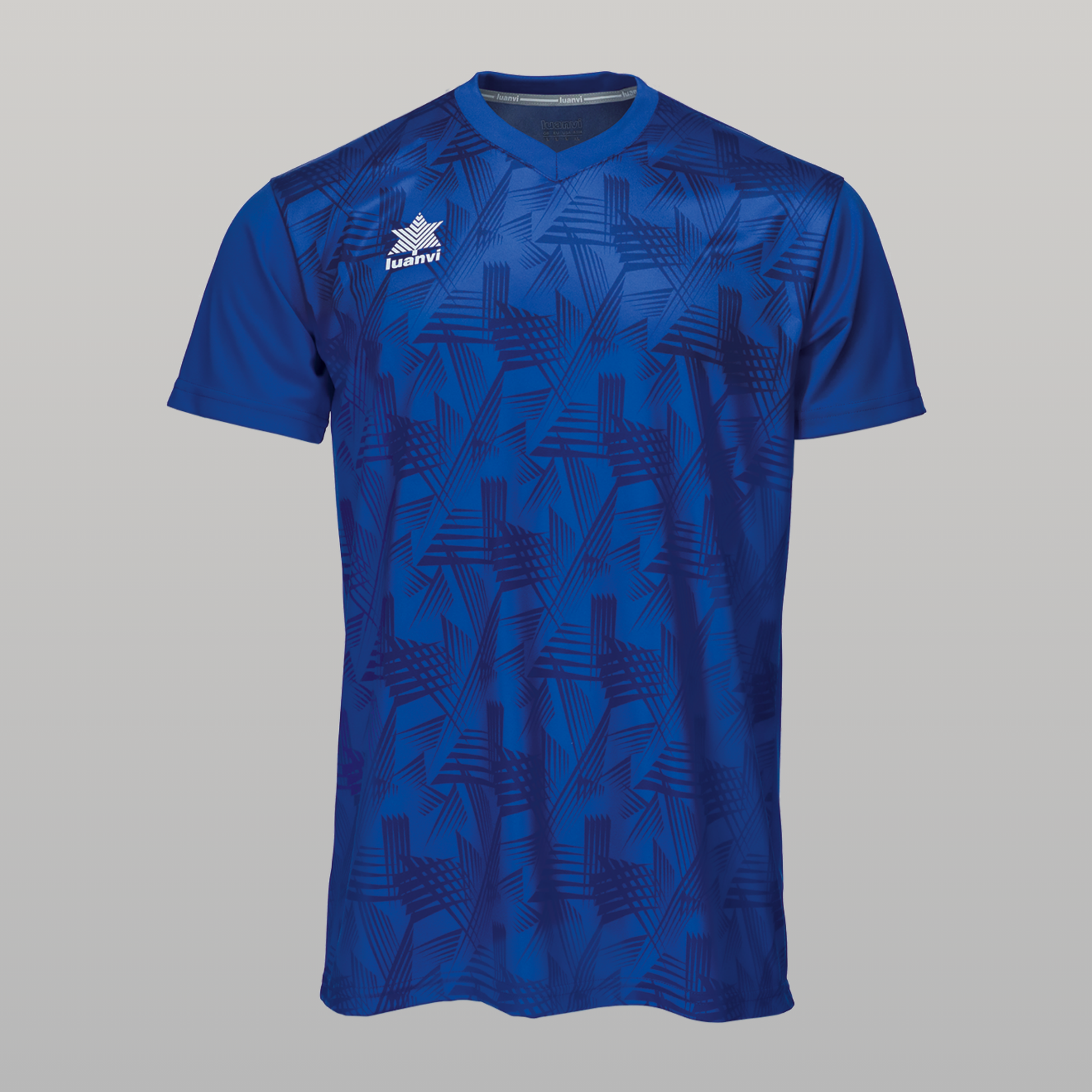 Camiseta técnica Luanvi PORTO, pensada para equipos que quieren un diseño llamativo con las prestaciones de una prenda de alto rendimiento. Su tejido con estampado integral geométrico y el cuello en pico le dan un estilo moderno, perfecto tanto para competición como para entrenamientos.