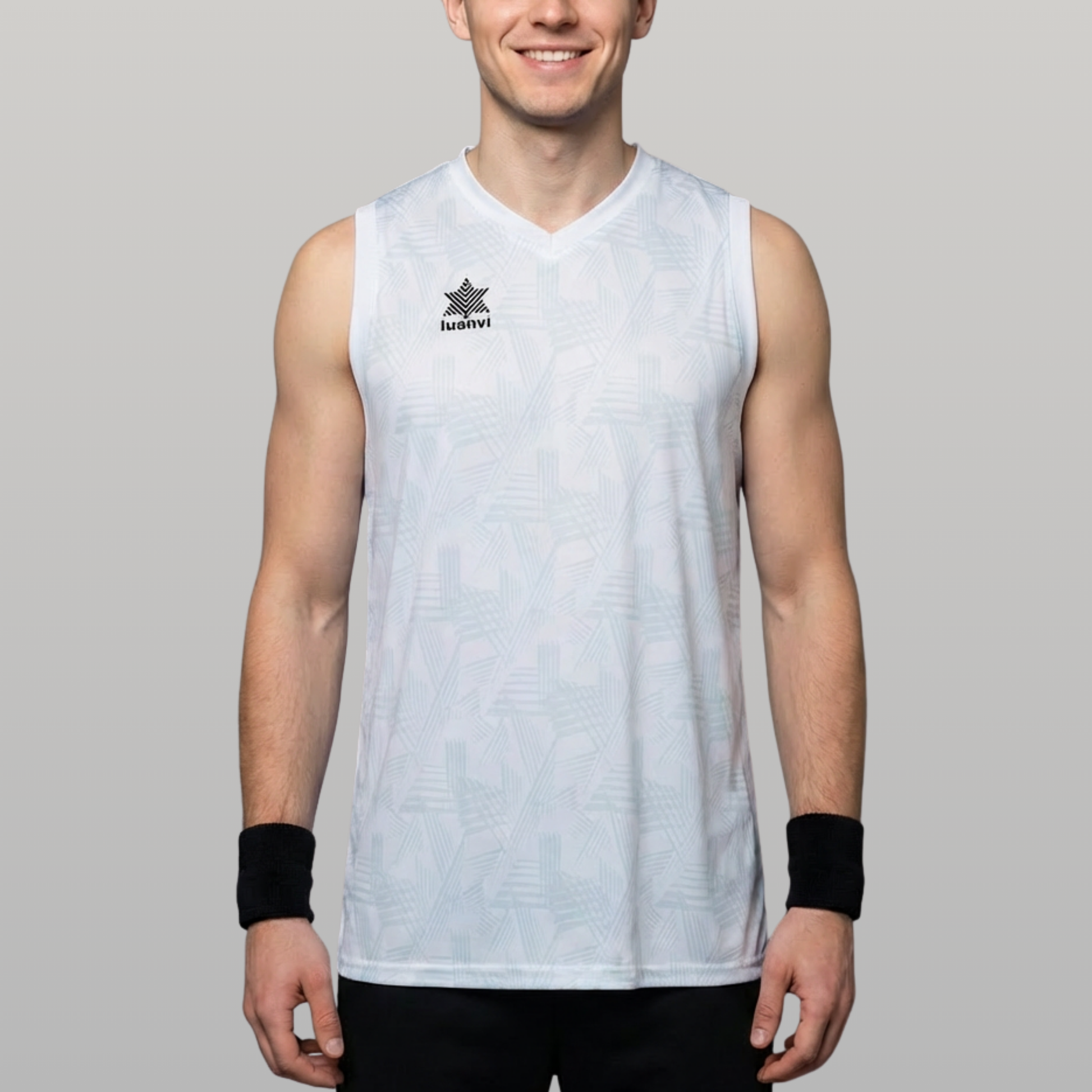 Camiseta técnica sin mangas Luanvi 15106 PORTO, diseñada para equipos que buscan un look diferente gracias a su estampado integral con textura geométrica. Su corte recto y holgado, junto con el sisado amplio, proporciona una gran libertad de movimiento en tiros, entradas a canasta y cambios de dirección, perfecta para partidos, entrenamientos y campus de baloncesto.