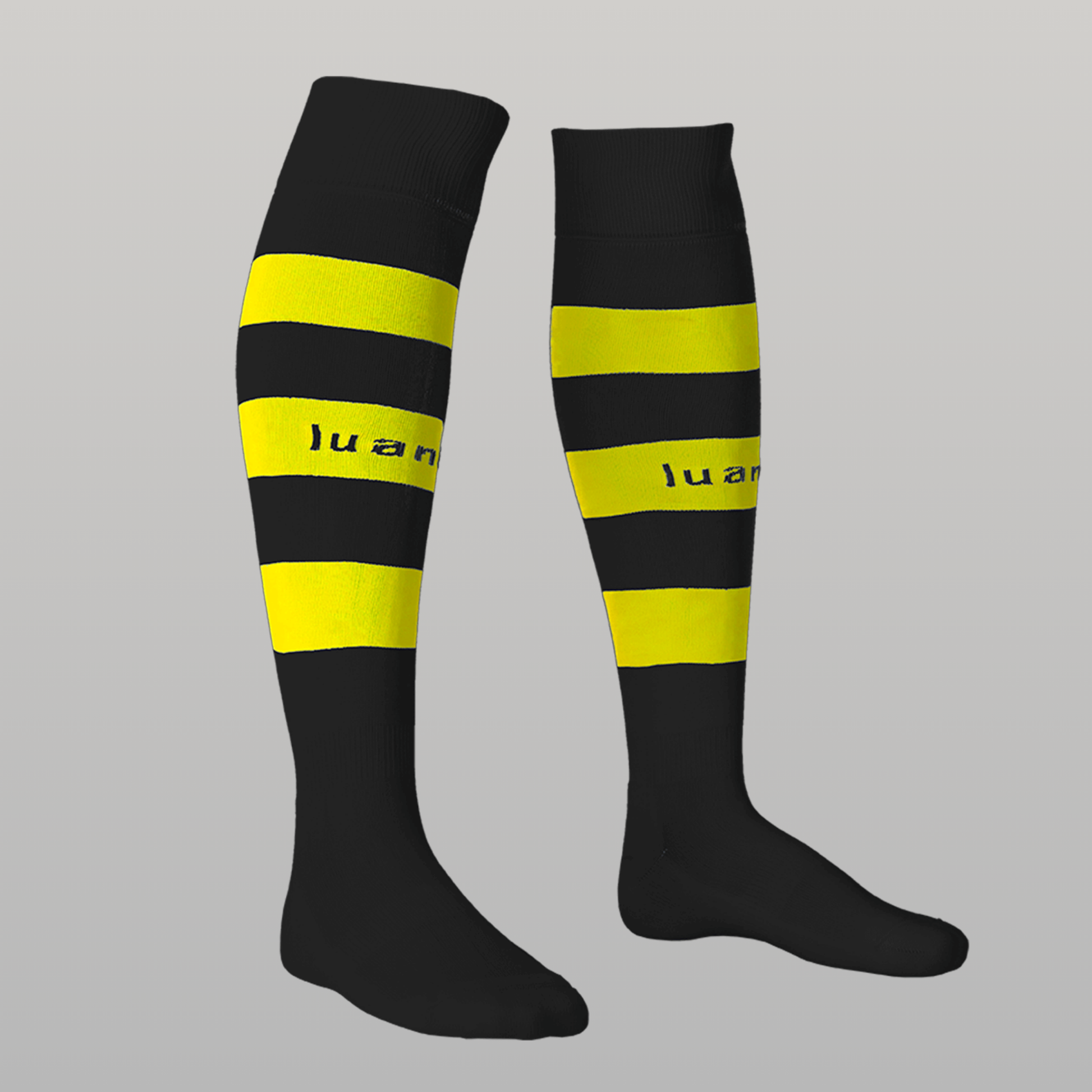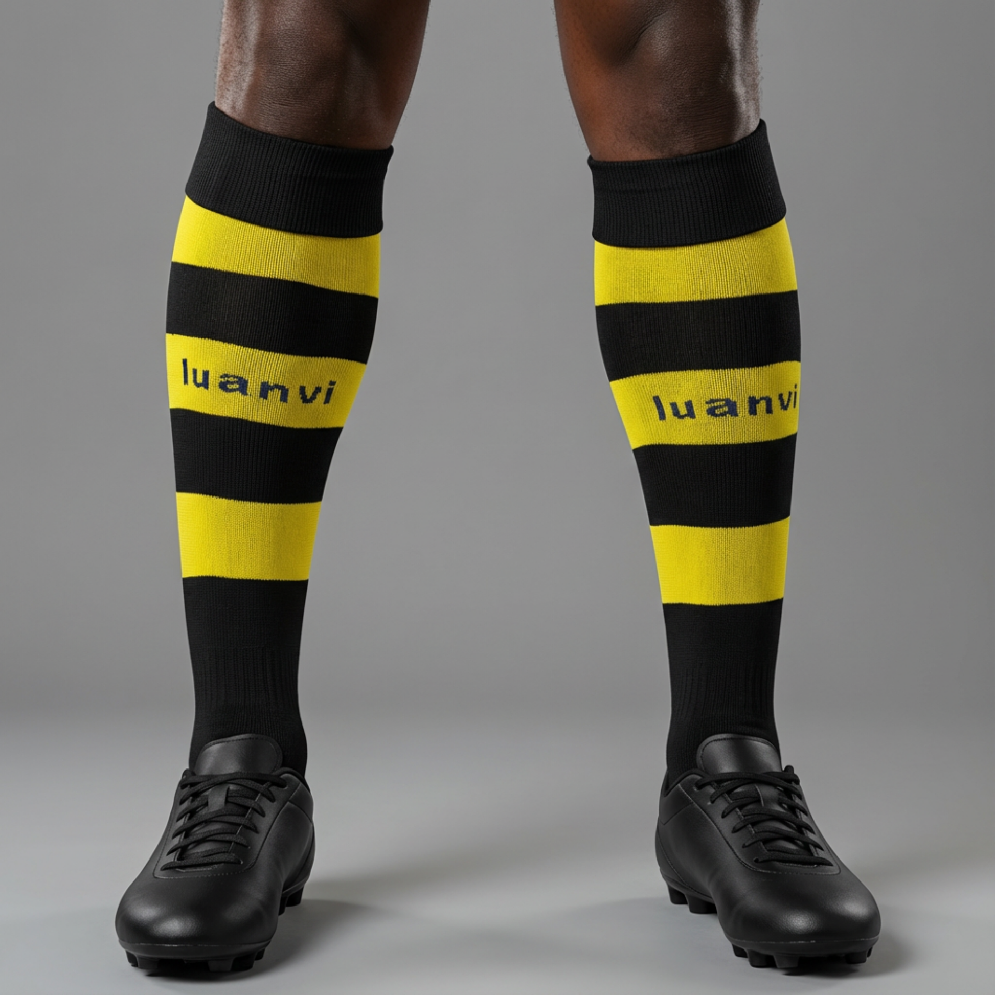 Medias técnicas Luanvi Listada, pensadas para equipos que quieren un toque clásico de franjas en su equipación sin renunciar al rendimiento. Su diseño de caña alta con bandas horizontales aporta personalidad al uniforme, a la vez que ayuda a mantener la espinillera en su sitio durante todo el partido.