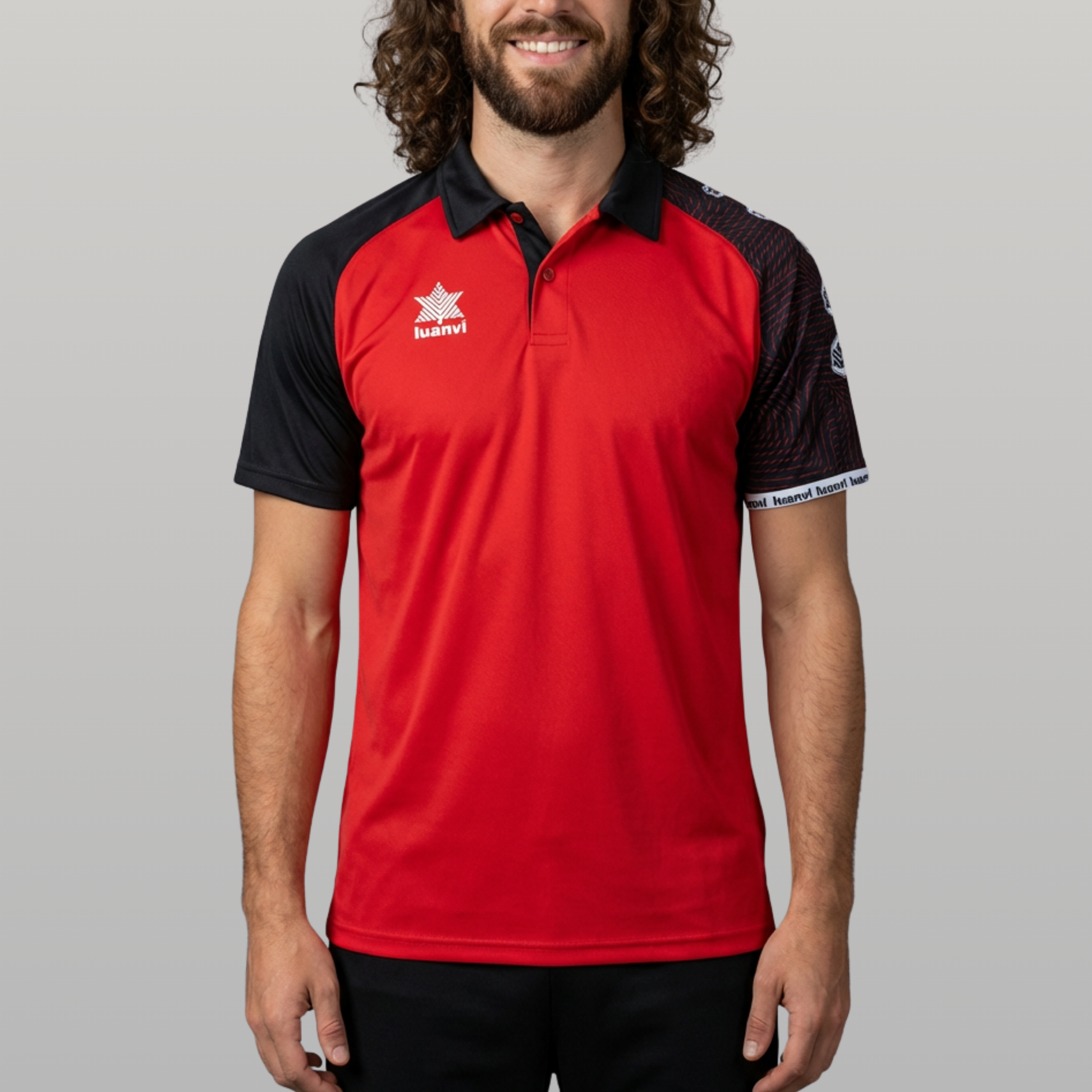 Polo técnico Luanvi OPEN, diseñado para clubes que buscan una prenda de paseo y representación con un punto diferente. El cuerpo liso contrasta con las mangas oscuras con gráfico deportivo y el cuello tipo polo, creando una imagen muy moderna para antes y después de los partidos, staff y delegaciones del club.